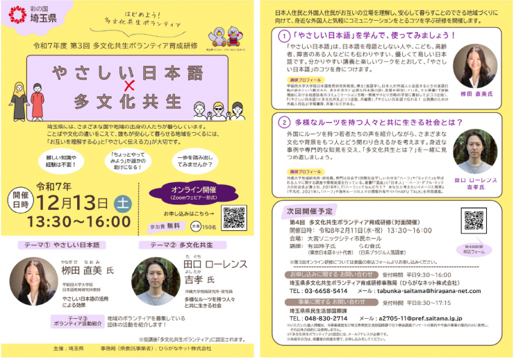 令和6年末時点の埼玉県の外国人住民数は26万人を超え、県民の約28人に1人が外国人です。今後も外国人住民数の増加が見込まれる中、日本人住民と外国人住民がお互いの立場を理解し、安心して暮らすことのできる地域づくりに向けて、「多文化共生ボランティア育成研修」を開催します。身近な外国人と気軽にコミュニケーションをとるコツや心構えを学べる研修に参加してみませんか。
