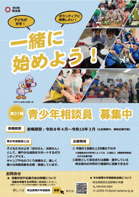 現在、令和8年4月1日から活動する子供の健全育成ボランティア「第31期埼玉県青少年相談員」を募集しています。