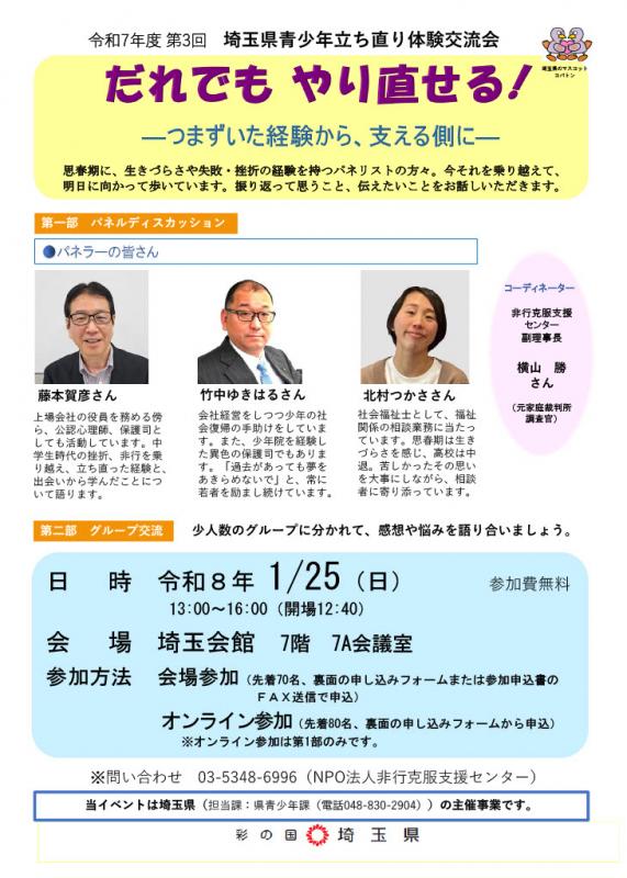 トップページ > 文化・教育 > 青少年 > 青少年の立ち直り支援・啓発キャンペーン等 > 青少年立ち直り体験交流会 > 令和7年度第3回埼玉県青少年立ち直り体験交流会