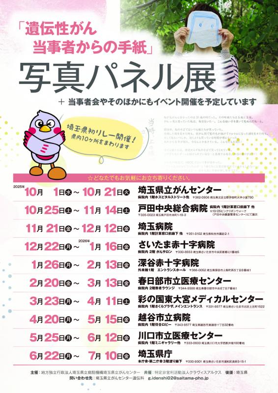 遺伝性がん患者さんの声を載せた写真パネルをリレー形式で展示するイベントを開催します。