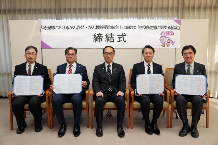 県民へのがんの正しい知識の普及や、がん検診の受診を促進するため、平成21年度から県と企業・団体との間で「埼玉県におけるがん啓発・がん検診受診率向上に向けた包括的連携に関する協定」を締結し、様々な普及啓発活動にご協力いただいています。