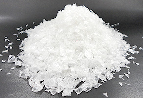廃ペットボトルから、 徹底した粉砕洗浄の末出来上がった真っ白なチップ(再生材、原材料)