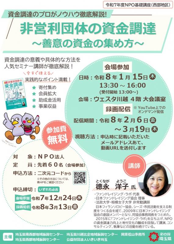 南西部地域振興センター、川越比企地域振興センター、同東松山事務所、西部地域振興センターと、公益財団法人いきいき埼玉は合同で、令和7年度NPO基礎講座を開催します。
