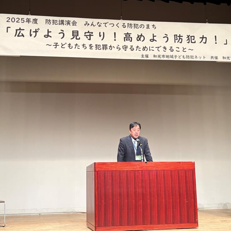 メンバーがいろいろな講演会などに参加して「この人、講師としていいなあ。」と思って、「こんな人がいるんですけれど」って和光市の危機管理室さんに相談することが多いです。和光市の防犯リーダー養成講座と兼ねる形で防犯講演会を実施していることもあり、講師との交渉や会場の確保などは市が、広報は当会が行っています。その際、市内小中学校保護者向け一斉送信メールでは教育委員会にも協力をいただいています。チラシのデザインは、和光市地域子ども防犯ネットのメンバーが作成しています。