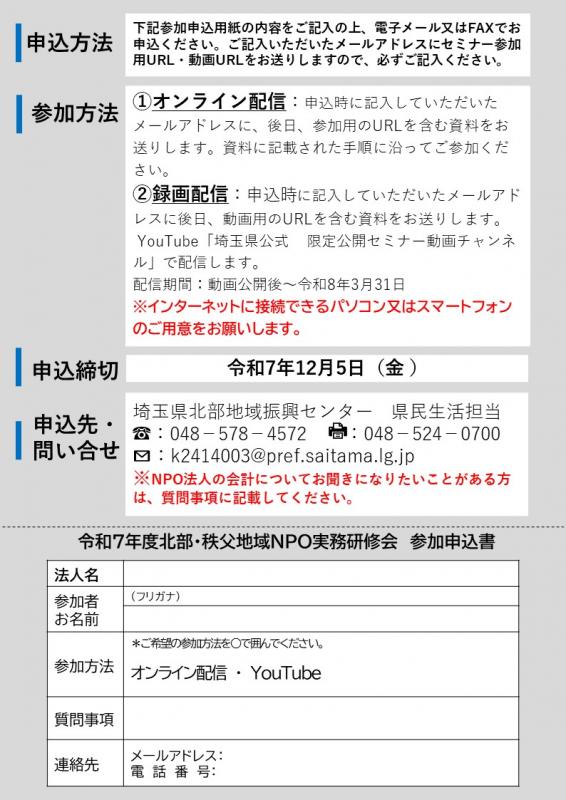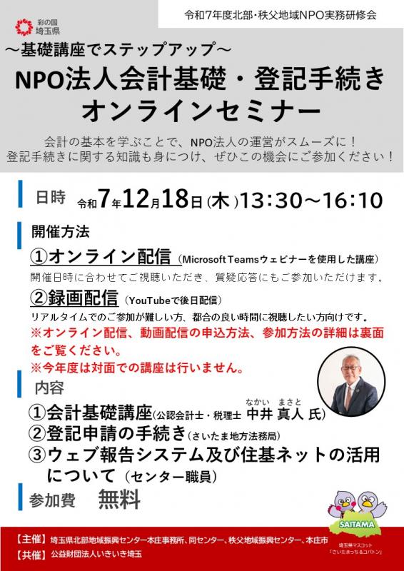 トップページ > 県政情報・統計 > 県概要 > 組織案内 > 企画財政部 > 企画財政部の地域機関 > 北部地域振興センター > 県民生活 > NPOイベントのお知らせ > 令和7年度北部・秩父地域NPO法人実務研修会