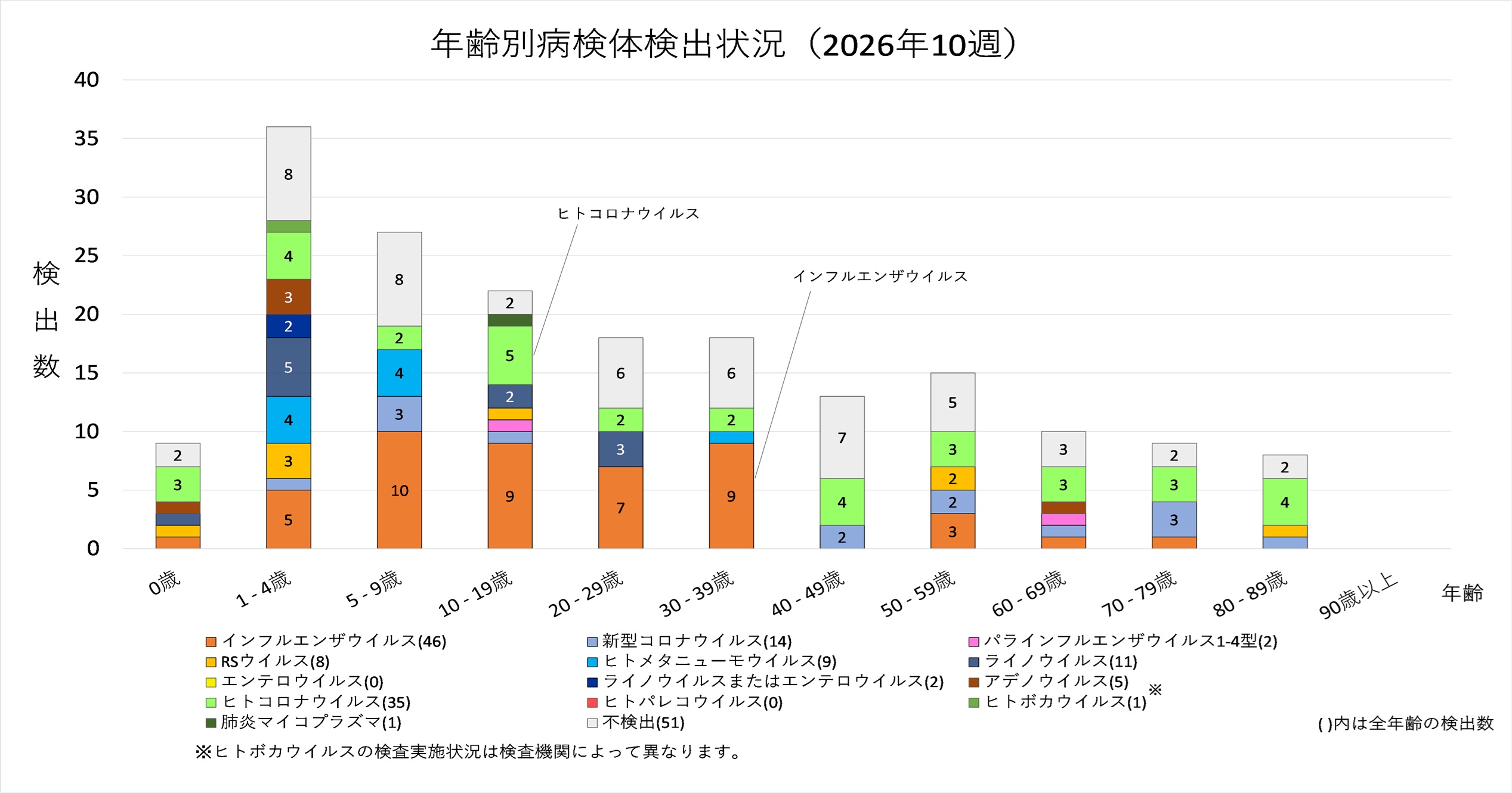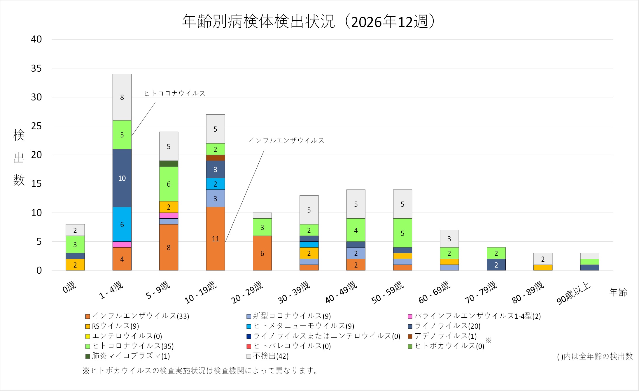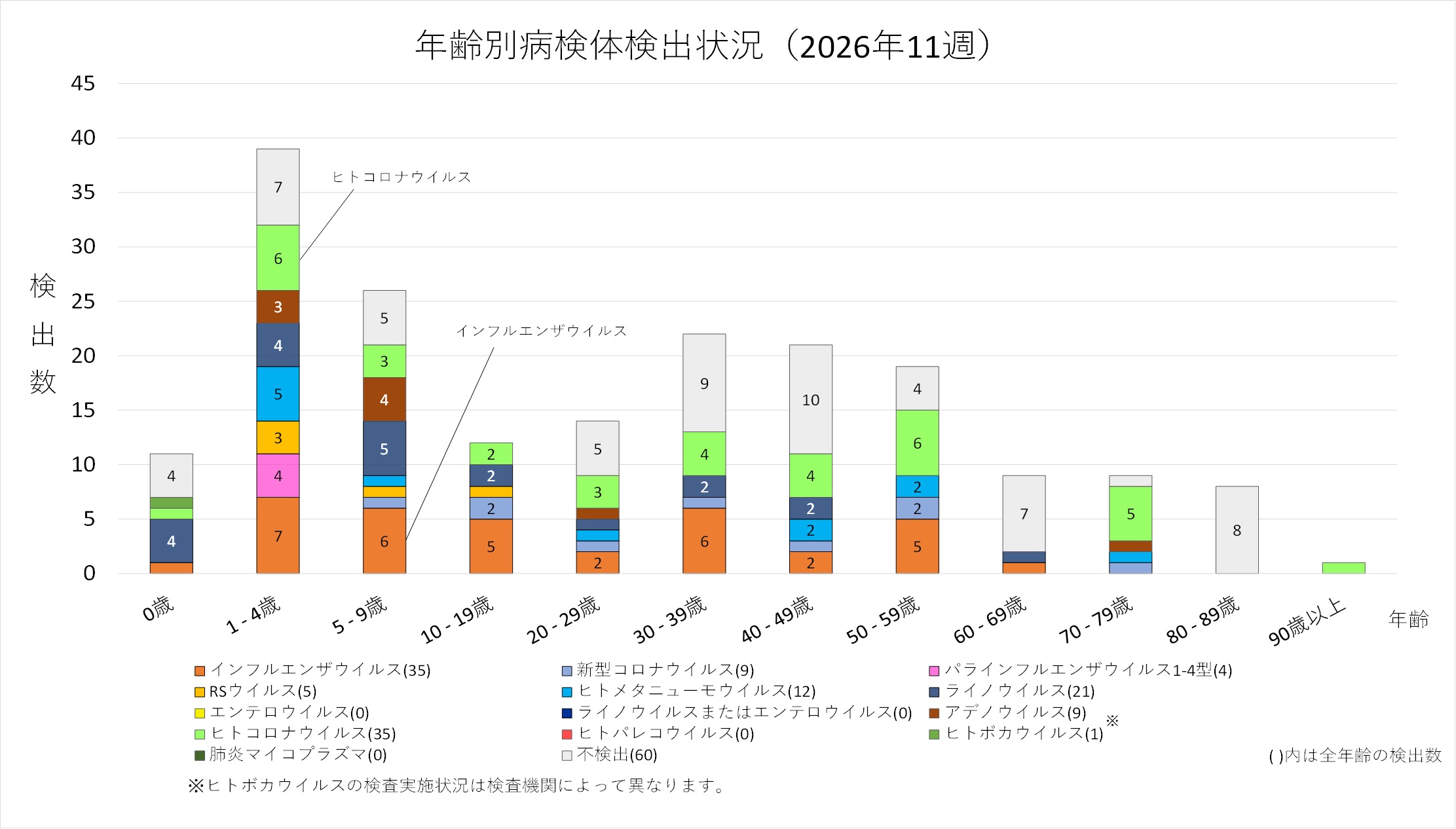 年齢層別では、インフルエンザウイルス、ヒトコロナウイルス及びライノウイルスがいずれも幅広い年齢層で検出されました。5歳から30歳未満ではインフルエンザウイルスが最も多く検出され、1歳から5歳未満ではライノウイルスが最多で、ヒトメタニューモウイルス及びヒトコロナウイルスの検出も目立ちます。