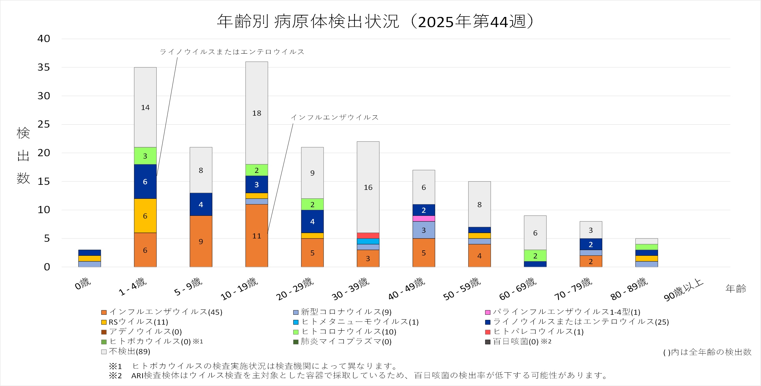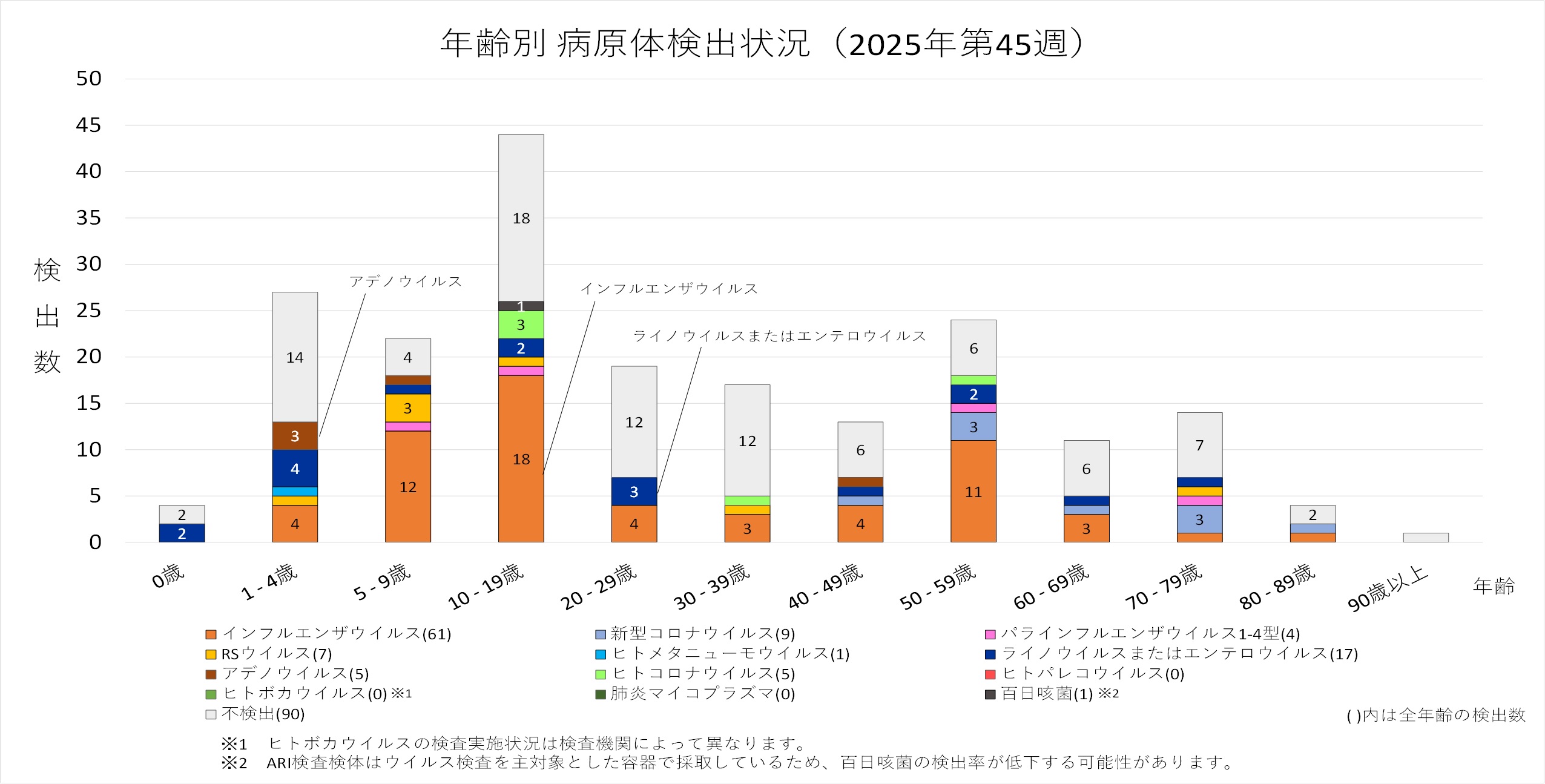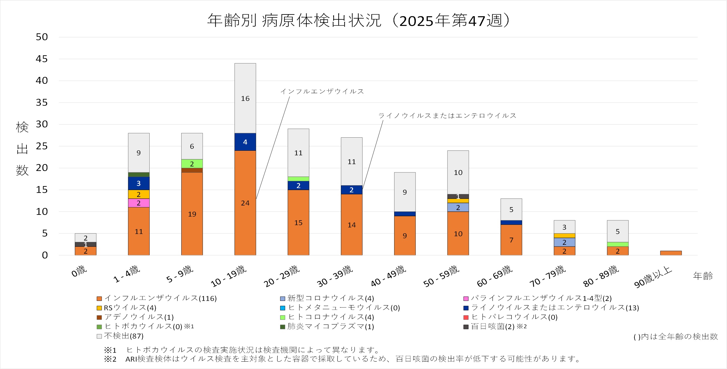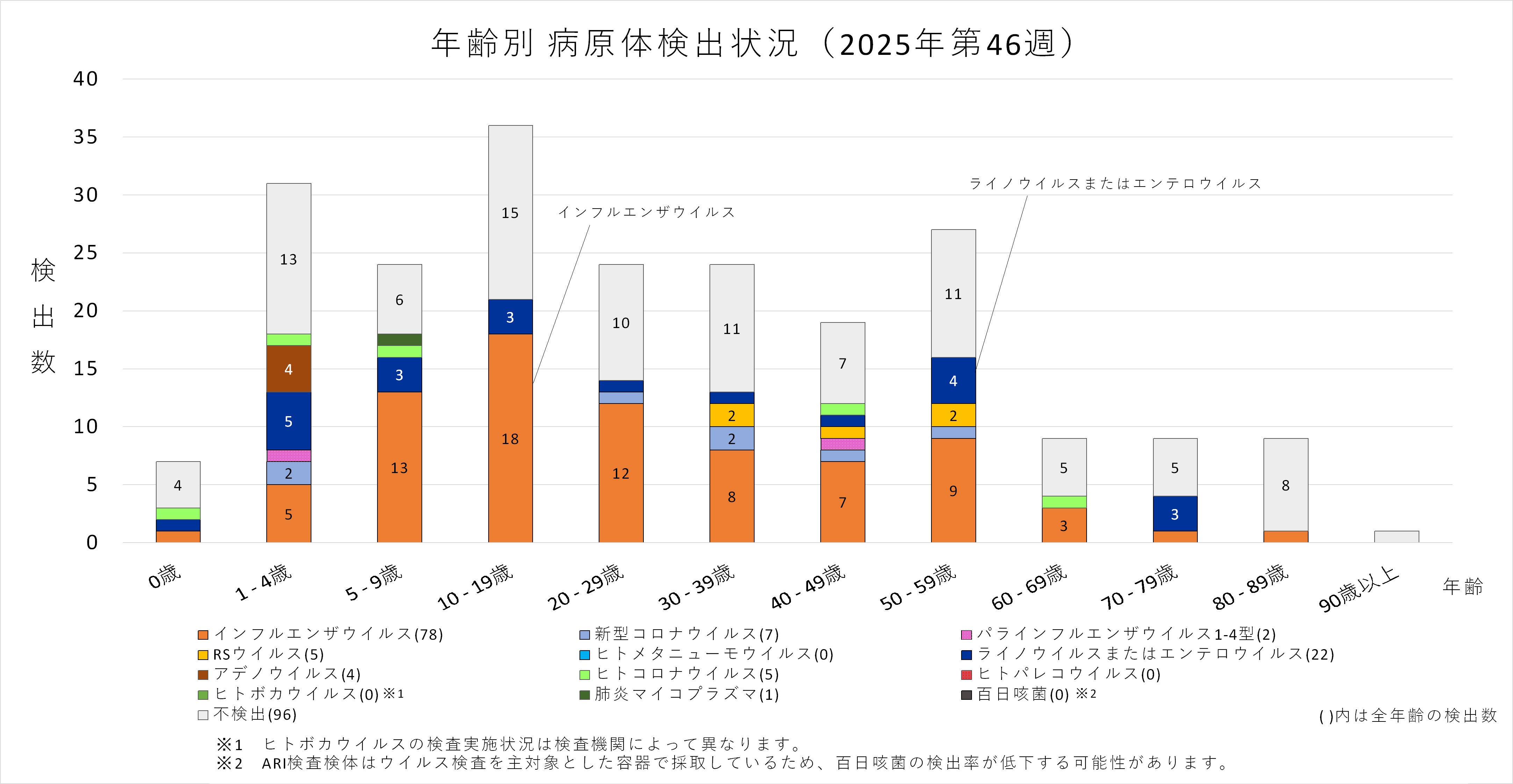 年齢層別にみると、0歳を除く年齢層でインフルエンザウイルスが検出され、多くの年齢層で優位に検出されています。0歳では「ライノウイルスまたはエンテロウイルス」が検出されています。
