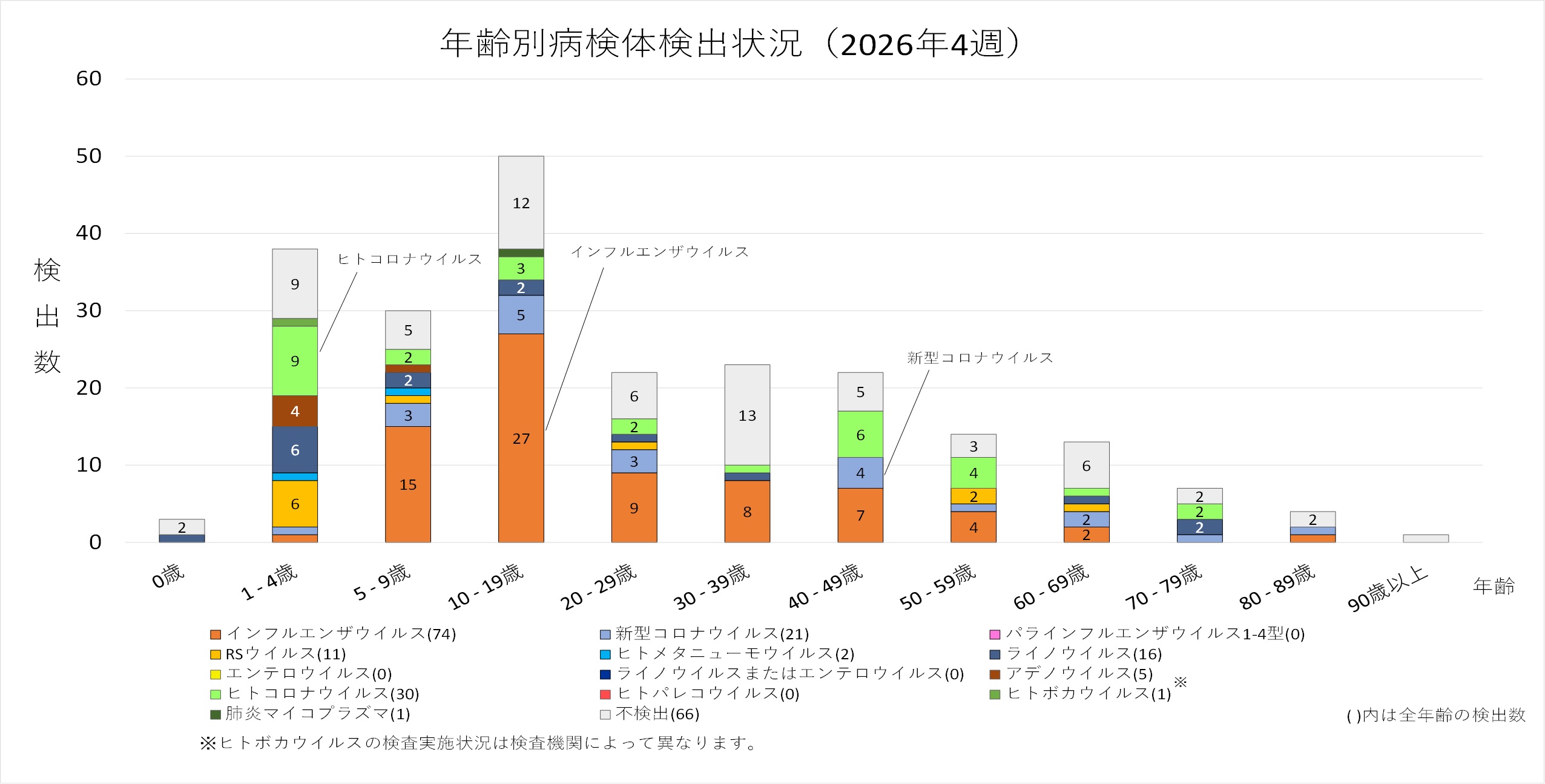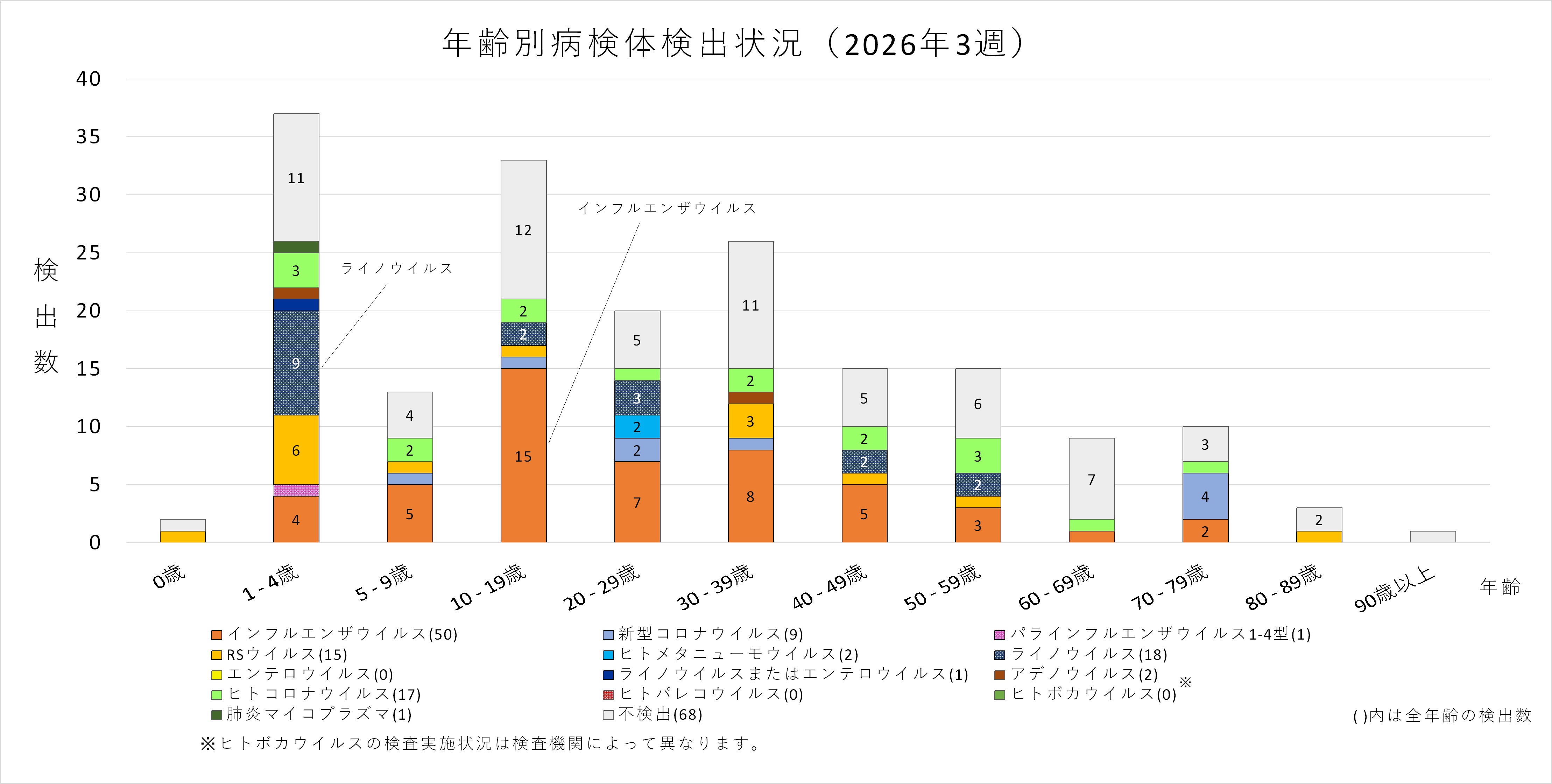 年齢層別にみると、1歳から70歳未満でインフルエンザウイルスが検出され、特に5歳から50歳未満でインフルエンザウイルスの検出が目立ちます。インフルエンザウイルス以外に1歳から5歳未満ではヒトコロナウイルス、ライノウイルス、RSウイルスなど様々なウイルスも検出されており、50歳から60歳未満ではRSウイルスの検出も目立ちます。