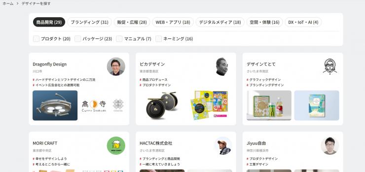 登録デザイナーは、「プロダクト」や「SNS・広報・PR」など、企業の課題別に検索することができます。