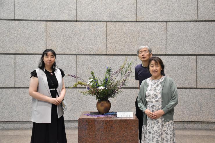 A:今回の主役は紫式部です。実がきれいに色づいて、るりまつりの花と合わさるとより涼しげに見えますよね。