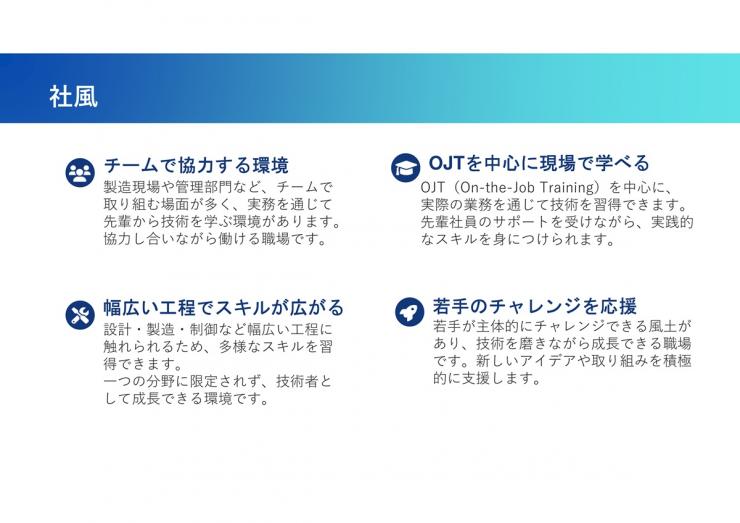 製造業では「稼働率向上」「人手不足の解消」「品質安定化」が大きなテーマであり、自動化はその解決策として社会的ニーズが高い分野です。そのため、技術者として価値の高いキャリアを築くことができます。さらに、弊社は部品加工や制御機器組立など幅広い事業領域を持つため、希望や適性に応じてキャリアの幅を広げやすい点も大きな特徴です。