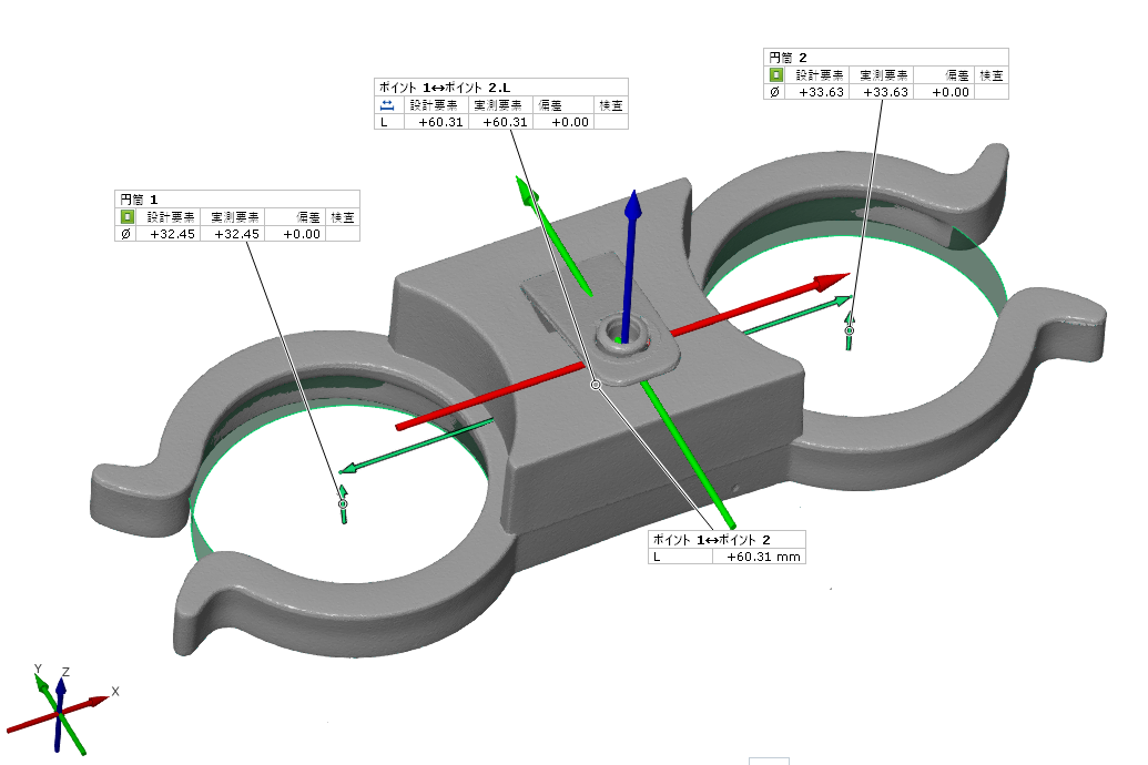 ポリゴン化(STL化)した3Dデータにより寸法測定や設計値比較等が可能です。 内部観察や簡易的な欠陥/介在物解析も可能です。