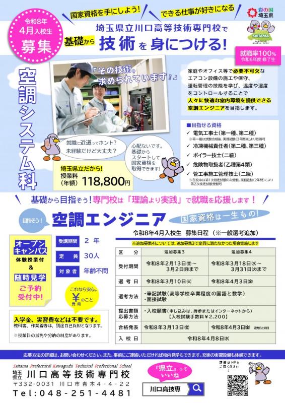 川口高等技術専門校では、情報処理科、空調システム科、機械科、ビル管理科を設置しています。