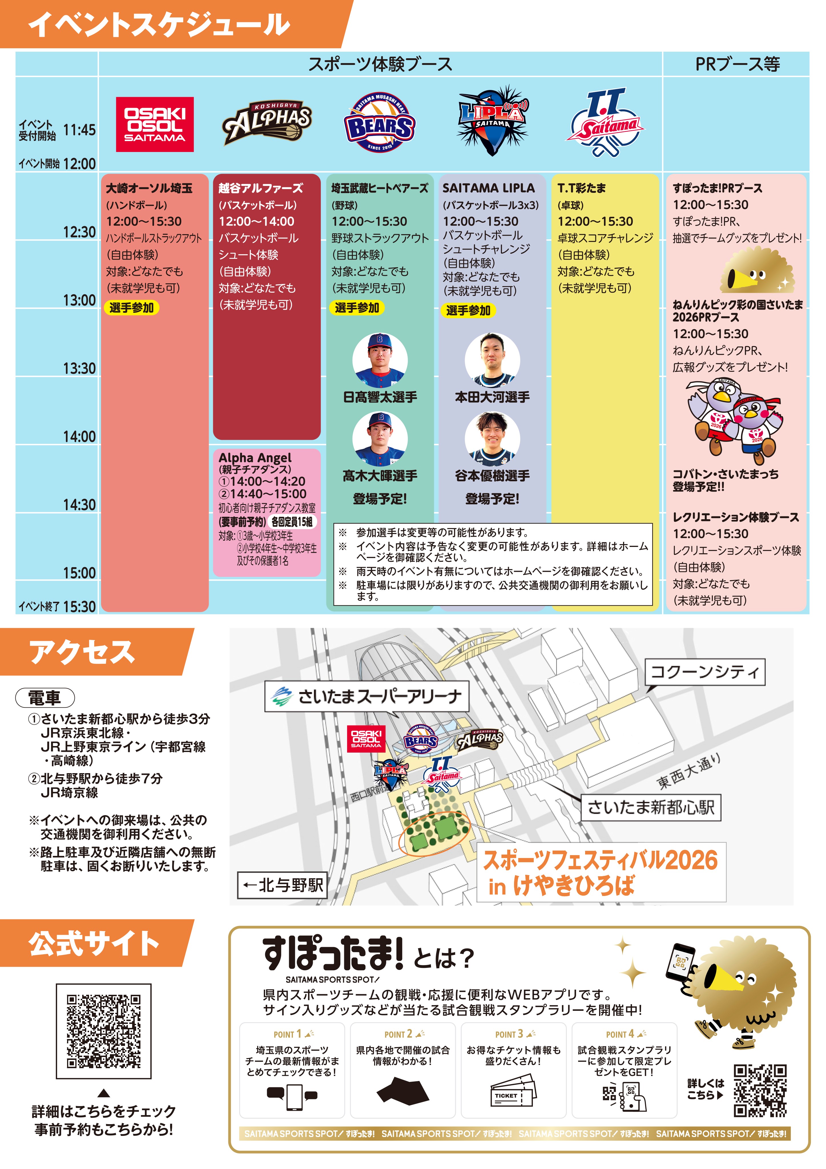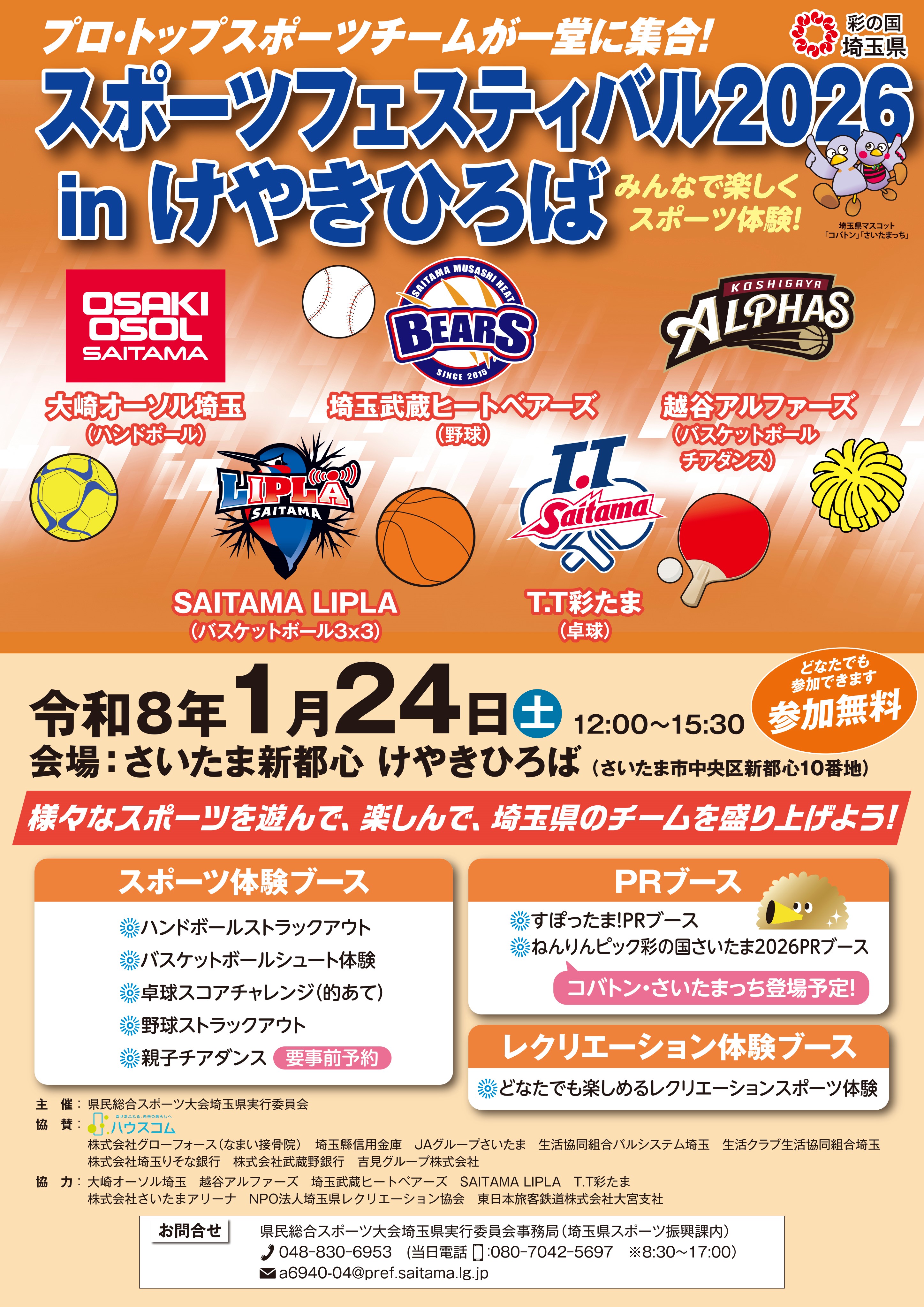 県内を拠点とする5チームによる様々なスポーツの体験や選手との交流ができる参加費無料のイベント、『スポーツフェスティバル2026inけやきひろば』を開催します。お子様連れの御家族をはじめ、年齢や障害の有無関係なく楽しめるイベントですので奮って御参加ください!これを機に埼玉県のプロ・トップスポーツチームを応援しましょう!